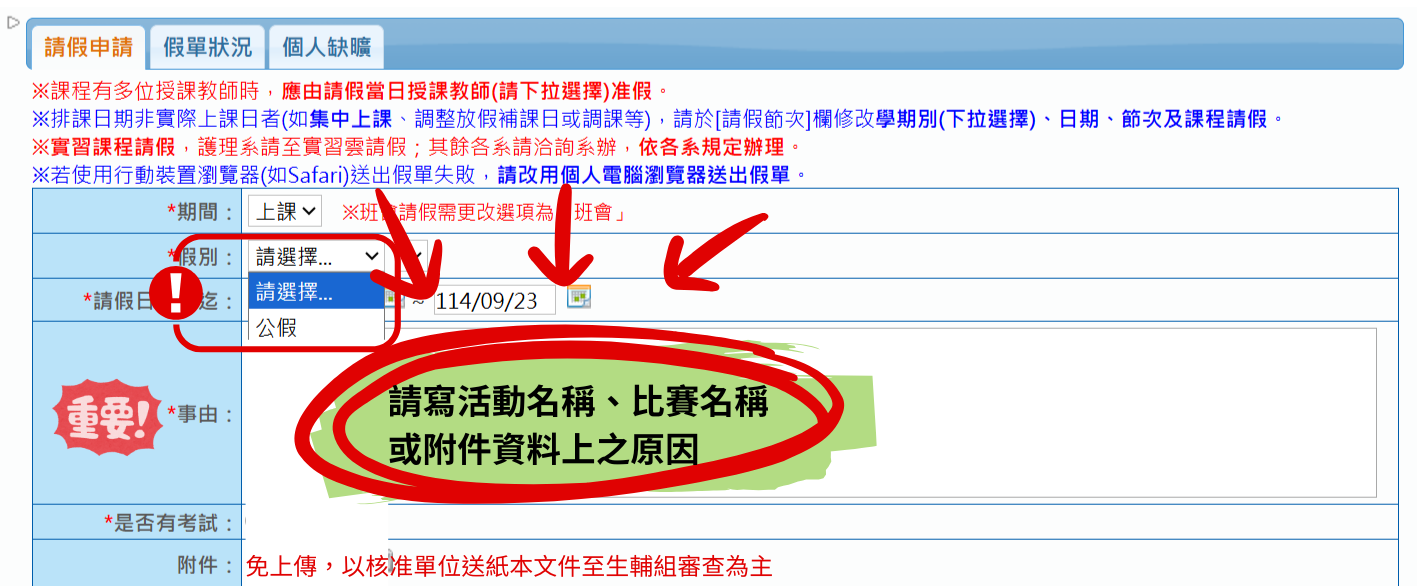 學生須於公假日前進入請假系統完成申請